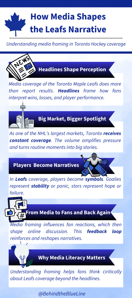Positive or negative framing affects fan discussions, player perception, and media coverage of trades, injuries, and coaching decisions. Media literacy helps fans look beyond the headlines and engage critically with the stories they read. This season, narratives around Matthews, Woll, and Tavares show that how the Leafs are covered can shape expectations, pressure, and fan conversation just as much as what happens on the ice.